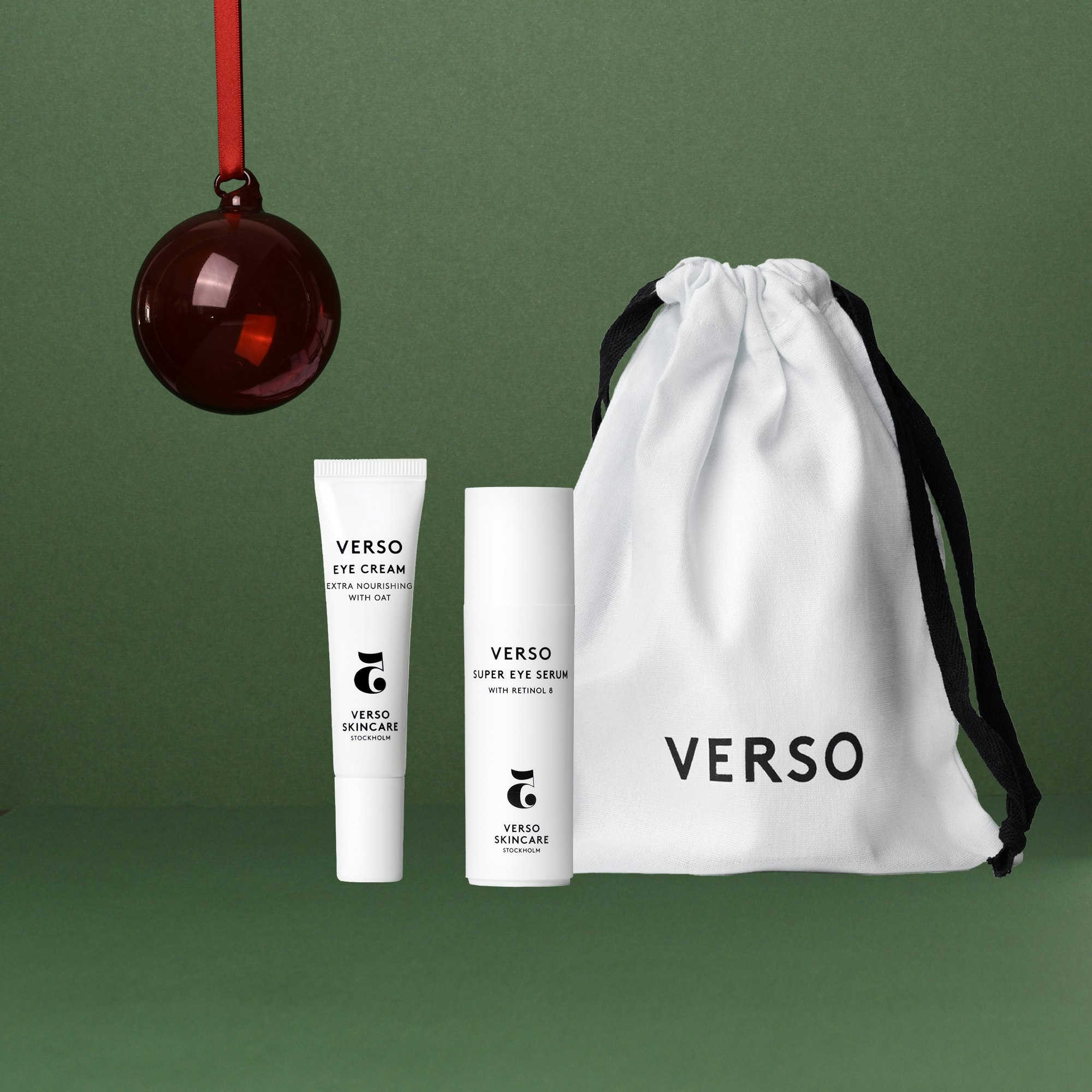 Die in diesem Kit enthaltenen Produkte sind die Verso Eye Cream und das Verso Super Eye Serum. Die Verso Eye Cream bietet mit ihrer reichhaltigen Textur ein Maximum an Feuchtigkeit und erhöht die Widerstandsfähigkeit der Haut gegen Umwelteinflüsse. Das Verso Super Eye Serum ist ein leichtes Pflegeprodukt, das die sichtbaren Zeichen der Hautalterung bekämpft und die müde Haut rund um die Augen belebt. Zu den Ergebnissen gehören ein geringeres Auftreten von Schwellungen und Augenringen, sowie ein gleichmäßigerer Hautton.